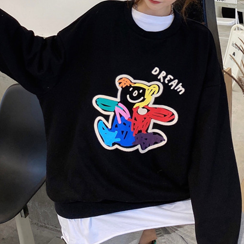 블랙 라운드넥 무지개 곰돌이 여성 캐주얼 맨투맨 티셔츠 J01