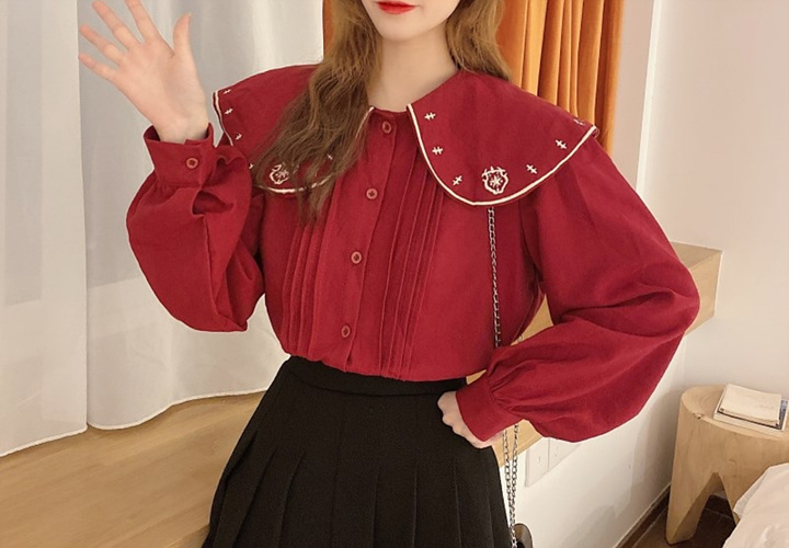 레드와인 라운드 빅카라 블라우스 여성 상의 긴팔 J25