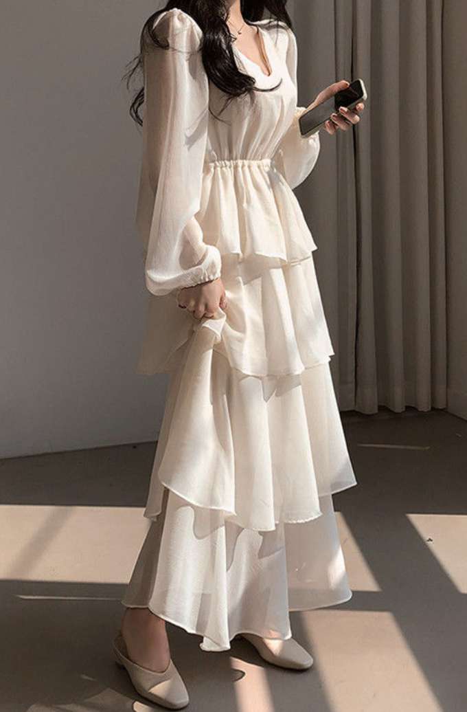 캉캉 원피스 5단 화이트 어깨포인트 긴팔 소매퍼프 J25