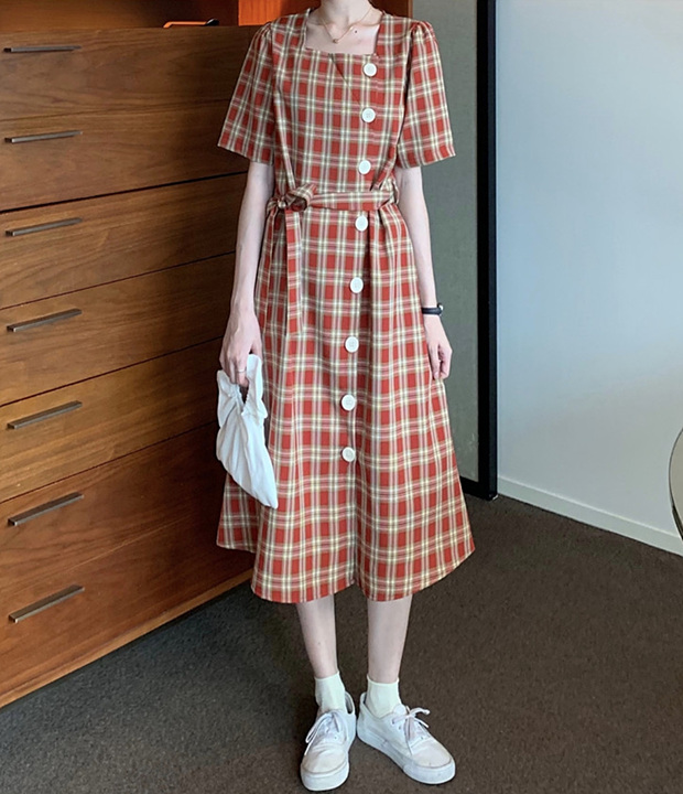 오렌지레드 체크 단추 스퀘어넥 롱원피스 J25