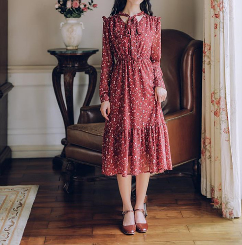 쉬폰 하객룩 봄원피스 롱드레스 셔링주름 리본끈 J19