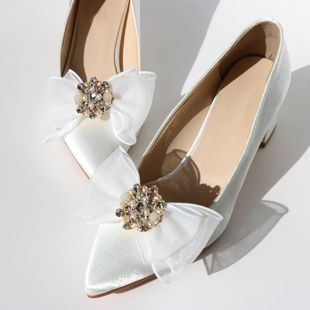 [자체제작] 웨딩슈즈코사지 셀프웨딩 클립형 스톤 핸드메이드 이중 리본 레이스 코사지