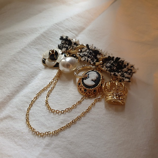 체인트위드 왕관 왕진주 명품브로치 옷핀브로치