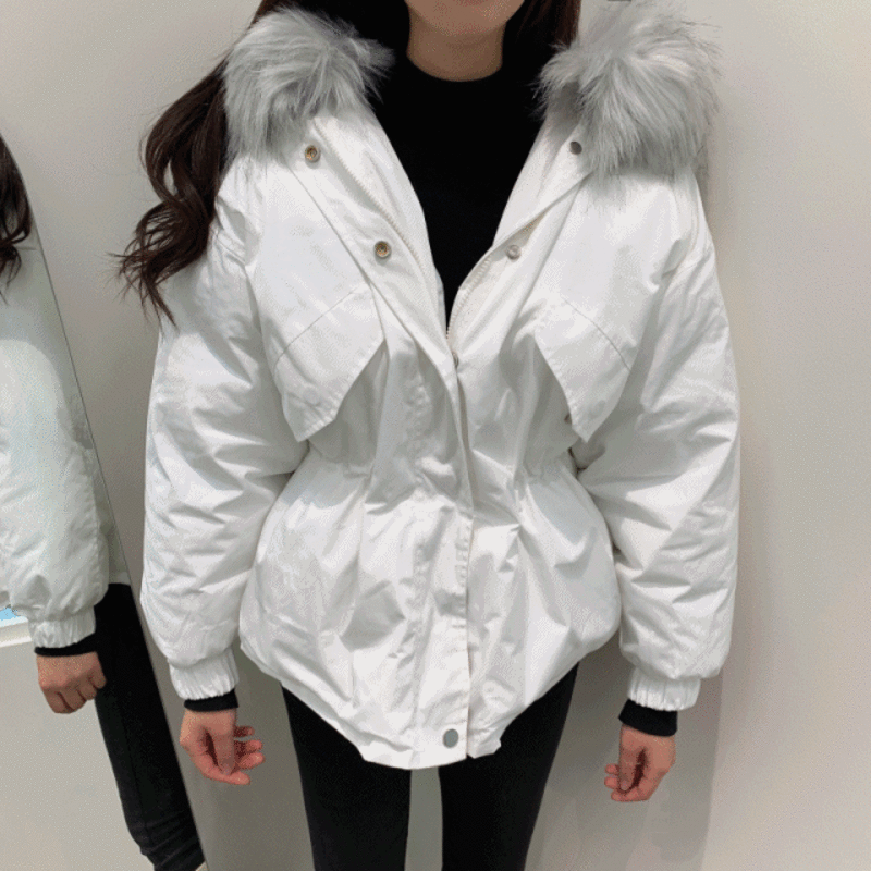 라쿤퍼 스트링 야상 숏 후드패딩점퍼(오리털충전재)