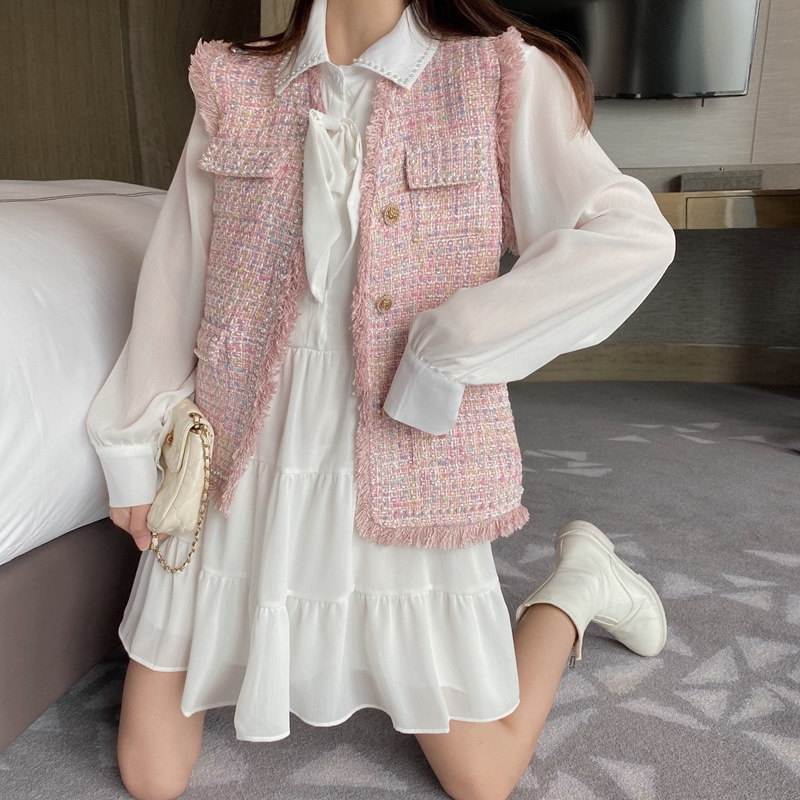리본 타이 프릴 셔츠 원피스 + 트위드 조끼 베스트