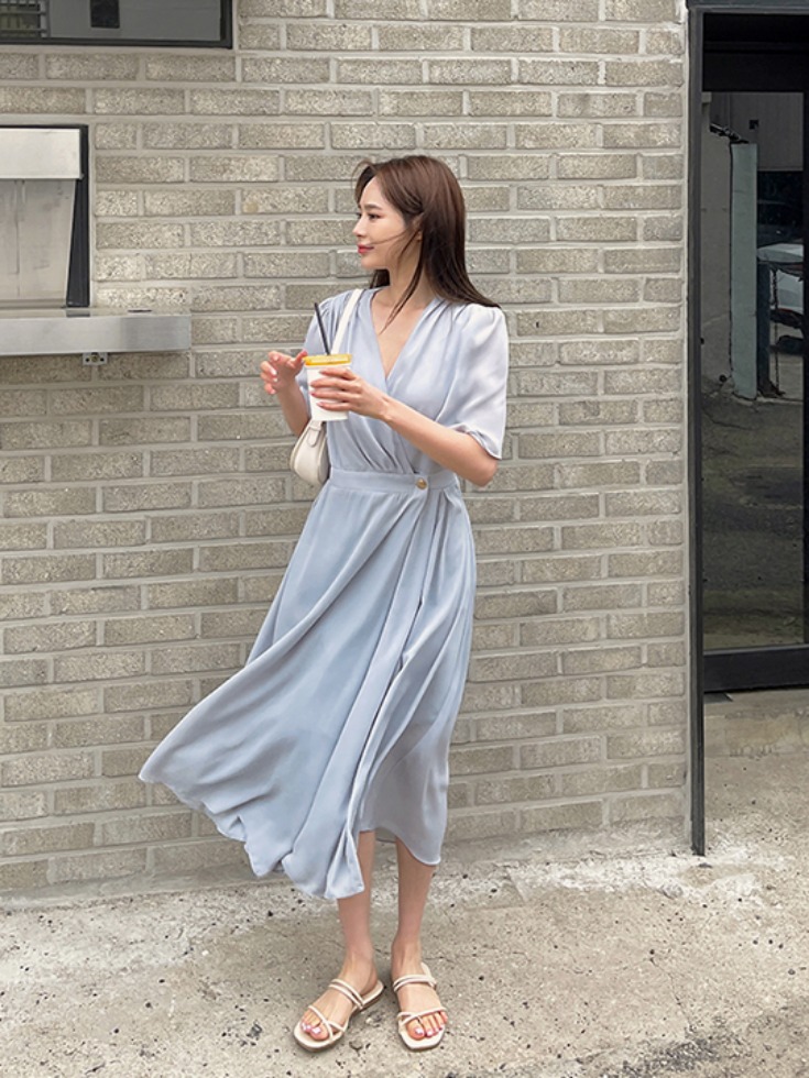 [6천장 돌파✨] [44-120] 캐론디 뒷밴딩 랩스타일 롱 원피스( 봄-가을-데이트룩-데일리룩-하객룩-격식룩-오피스룩-출근룩-여행룩-공항룩-빅사이즈-120사이즈-자체제작-밴딩-뒷밴딩-랩-여신핏-여성스러운-여리한 )