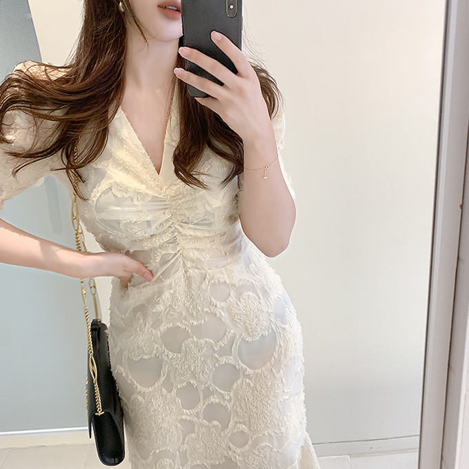 여신강림 깃털 레이스 퍼프 셔링 머메이드 플레어 롱 원피스 (아이보리/블랙)