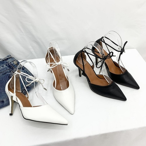 사이드 오픈 발목 리본 끈 스트랩 스틸레토 하이힐 펌프스 8.5cm