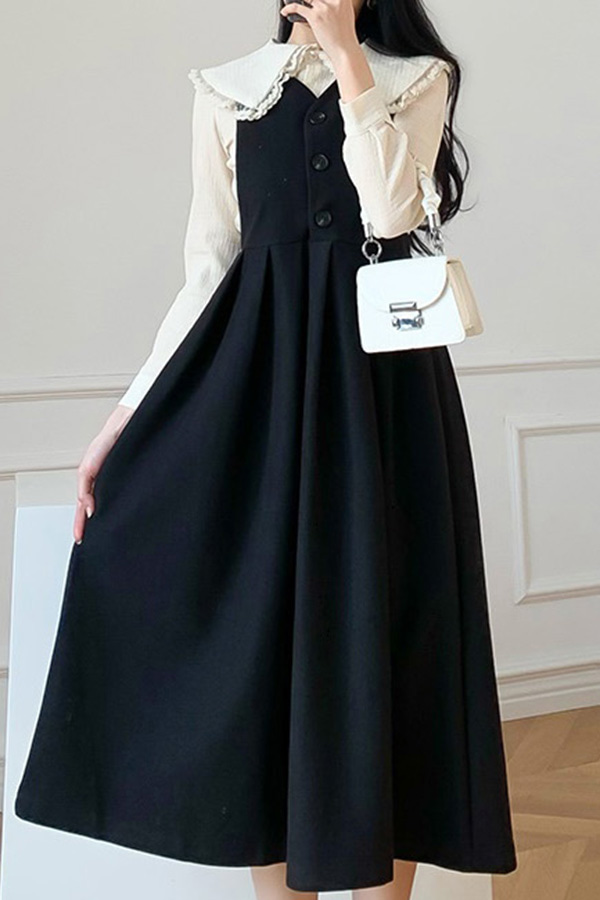 [해외/수입] 그대 나는 괜찮아 빅사이즈가능 배색포인 심플모던 레이스포인 카라넥 블라우스 & 브이넥 하프단추 주름셔링 플레어 롱원피스 세트
