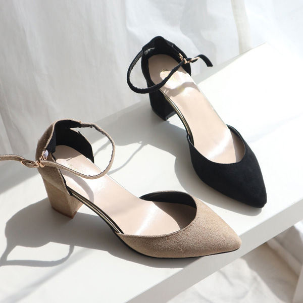 [225-265mm] 항상 예뻐 7cm 스웨이드 샌들 구두 (블랙 베이지) 발목 스트랩