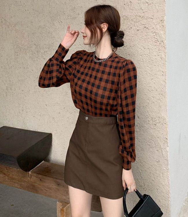 오피스 패션 심플 체크 퍼프 블라우스