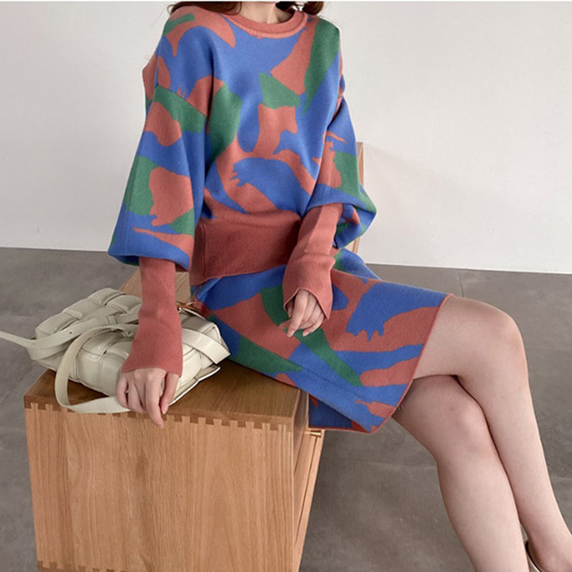 [SET] 밀리터리카모 패턴 니트 코디셋업 (오렌지,그린,블랙)