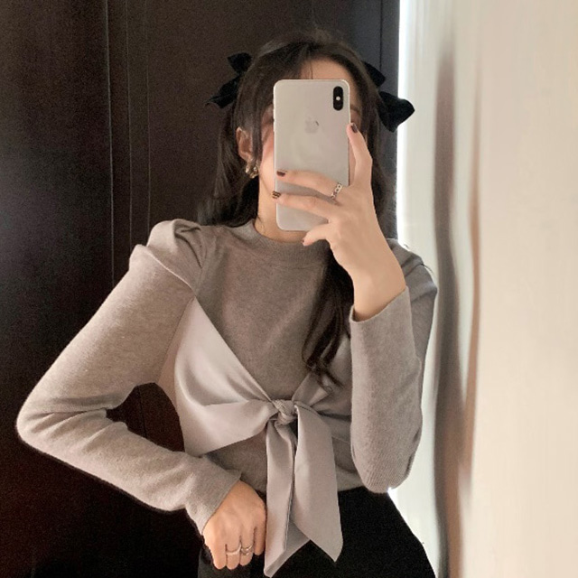 무료배송 리본바스트 라운드긴팔탑 (블랙,그레이,브라운)