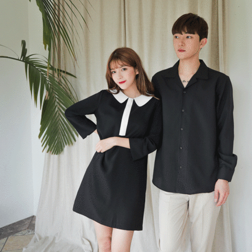 [커플시밀러룩]코코 카라 원피스/여(상의),노아 무지 오버핏 셔츠/남(상의), 노턱 베이직 팬츠/남(하의)