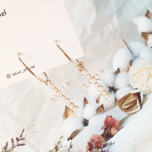 미니 진주 십자가 원터치 링 볼드 드롭 귀걸이