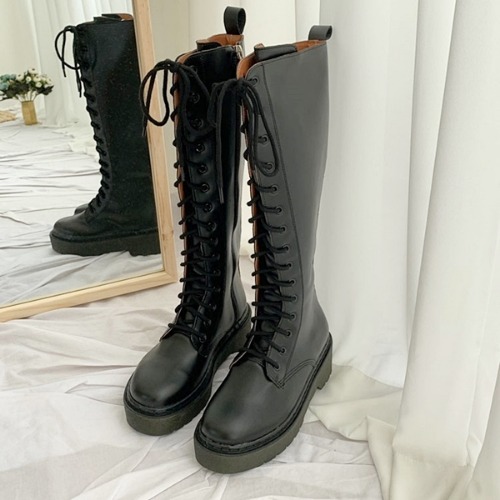 유니크 레이스업 끈 통굽 롱부츠 4cm