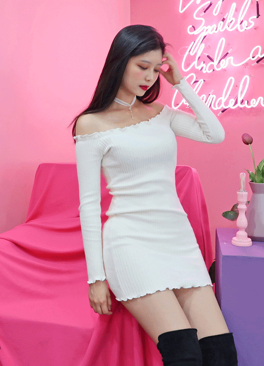 [재입고완료] 프릴 H라인 셔링 오프숄더 니트 원피스