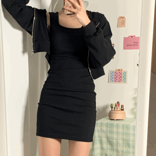 쫀쫀 사쿠야 골지 니트 크롭 후드 집업 나시 미니 원피스 세트