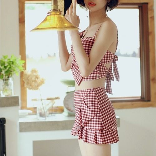 레드체크 리본 크로스 프릴 비키니 3pcs 휴양지 풀파티 호캉스 신혼여행 여행룩 동남아 온천 스파 바캉스 휴가