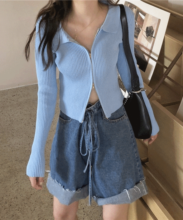슬림핏 카라 지퍼 집업 골지 크롭 니트 3color