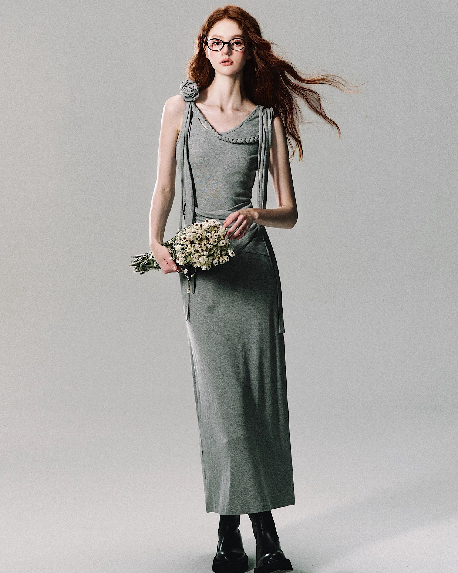 OAKMOO vine and I 라이트 그레이 플라워 코사지 드레이프 나시 롱 드레스