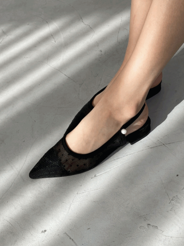 리들리 1.5cm 진주 포인트 도트 메쉬 시스루 플랫 스틸레토 슬링백힐 여자 단화 구두