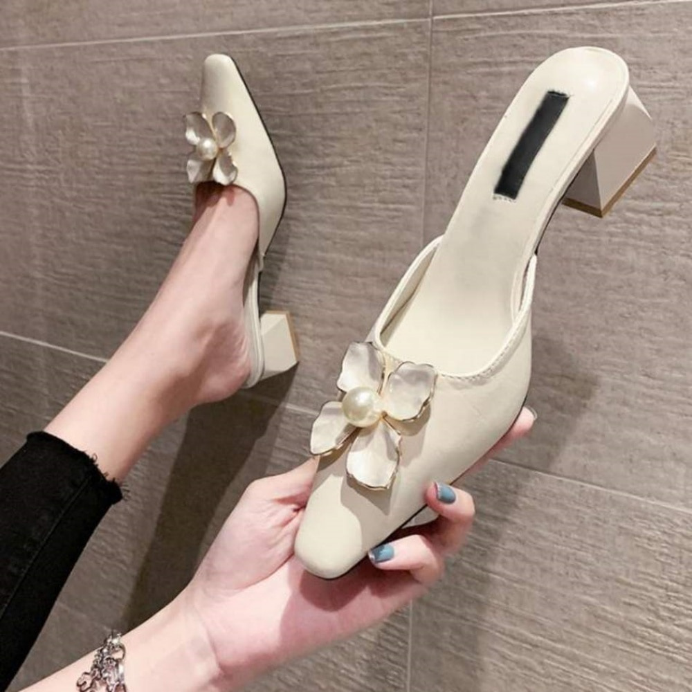 (이벤트225) 프리센 5cm 스퀘어토 플라워 통굽 슬리퍼 뮬 3color