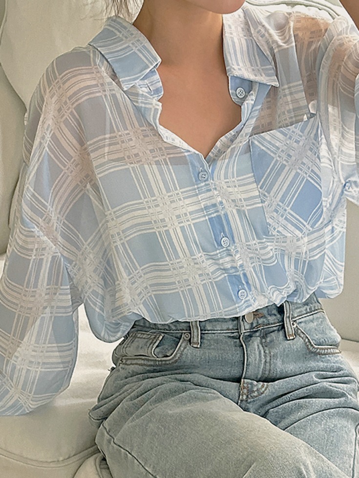 [9천장 돌파✨][44-120] 펠로킹 체크 시스루 루즈핏 셔츠 (여름-바캉스룩-여행룩-휴양지룩-공항룩-캐주얼룩-빅사이즈-120사이즈-자체제작-오버핏-비치는-긴셔츠-통넓은-체크-시스루-시원한-편안한)