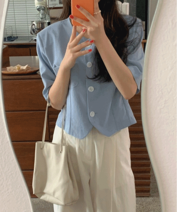 [sale/초특가!!] 무지 배색 버튼 브이넥 반팔 자켓 블라우스 셔츠