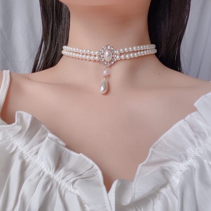 다이애나 두줄 진주 큐빅 드롭 초커 목걸이