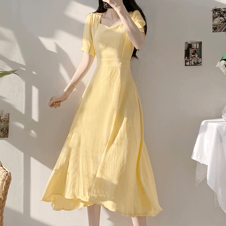 [🚀당일발송/4color/대존예핏] 여름 린넨 하트넥 퍼프 플레어 뒷리본 하객 반팔 롱 원피스