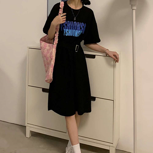 블랙 여성 캐주얼 데일리 허리 벨트 버클 미디 원피스 J10