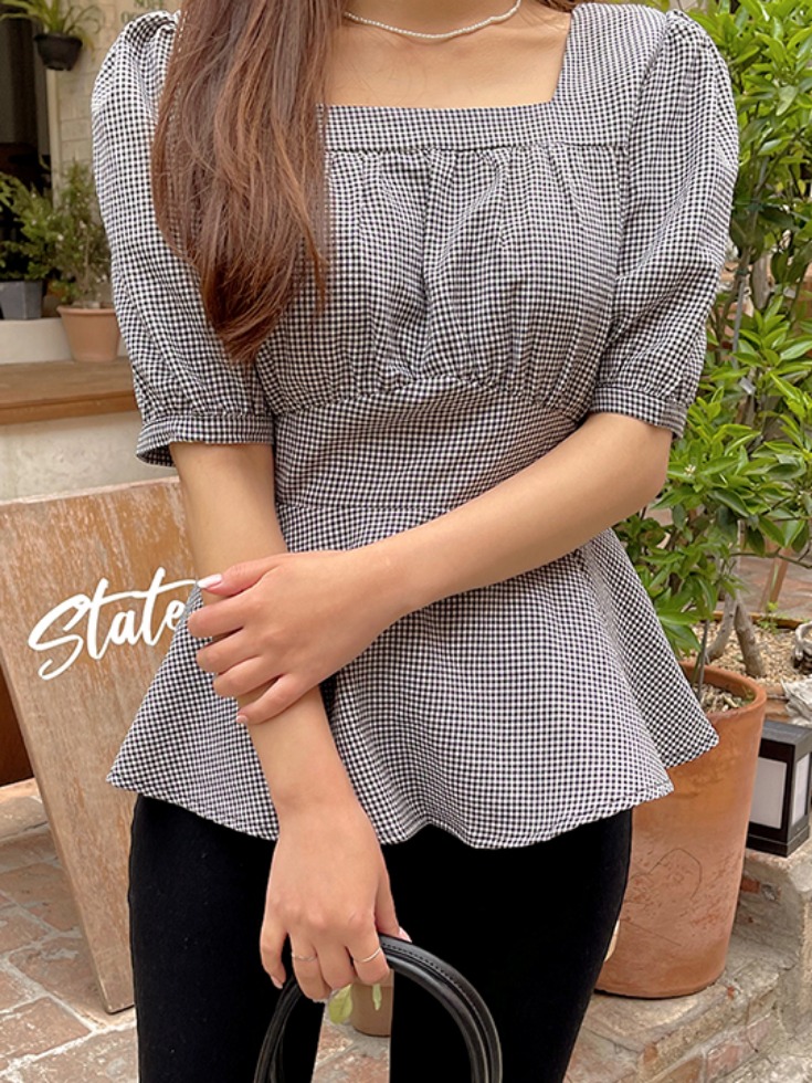 [5천장 돌파✨] [무료배송] [44-110] 블로인비 스퀘어넥 체크 뒷리본 블라우스 ( 여름-데일리룩-데이트룩-캐주얼룩-캠퍼스룩-하객룩-격식룩-출근룩-빅사이즈-120사이즈-자체제작-시원한-가벼운-반팔블라우스 )
