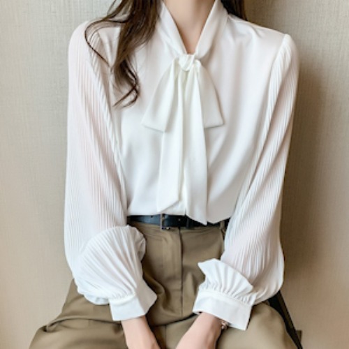 [오피스룩/면접]리본 블라우스 빅사이즈 화이트 v넥 타이 물결 셔링 블라우스 오피스룩 면접 셔츠