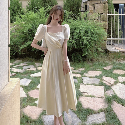 [소개팅룩] 청순크림 아이보리 나나 스퀘어넥 셔링 롱원피스 셀프웨딩 여름 하객룩 피로연 돌잔치원피스 SST-172