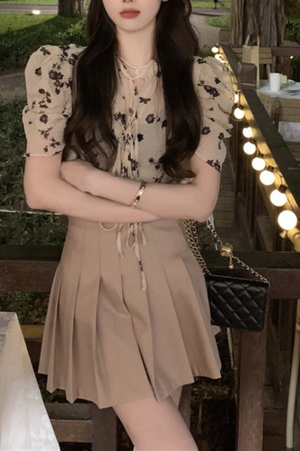 set 플라워 버블 반팔 블라우스 플리츠 치마 세트