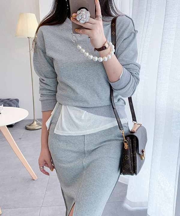 스커트세트) 데끼데일리 투피스맨투맨코디룩 (그레이,베이지)