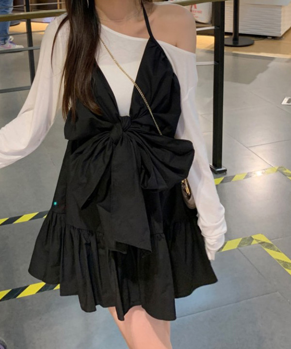 코디세트) 빅사이즈 코디세트) 빅리본 루즈핏티셔츠 레이어드룩(화이트,블랙)(블랙,화이트)-스커트세트
