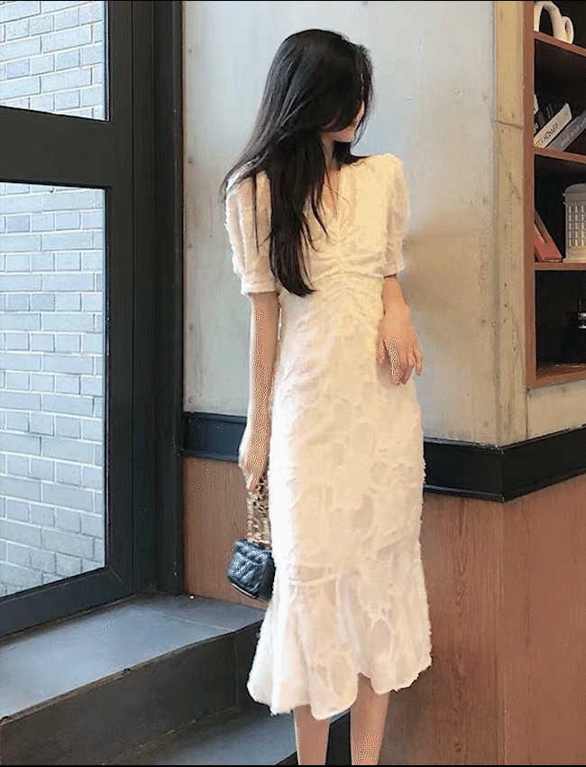 [셀프웨딩/컨셉촬영]브라이덜샤워 v넥 허리슬림 머메이드 깃털 롱 드레스 원피스
