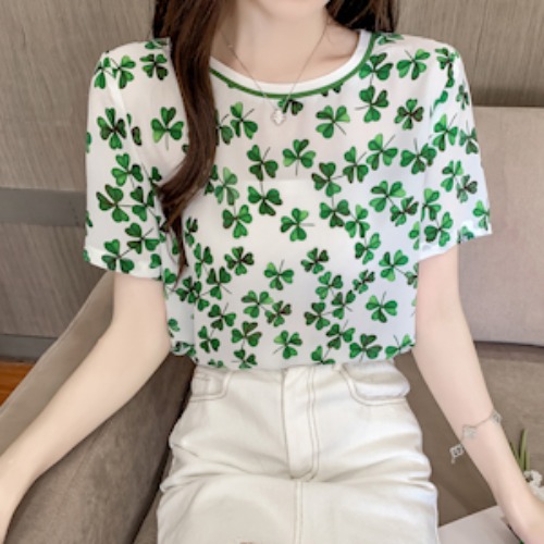 세잎클로버 라운드U넥 쉬폰 반팔 꽃 티셔츠