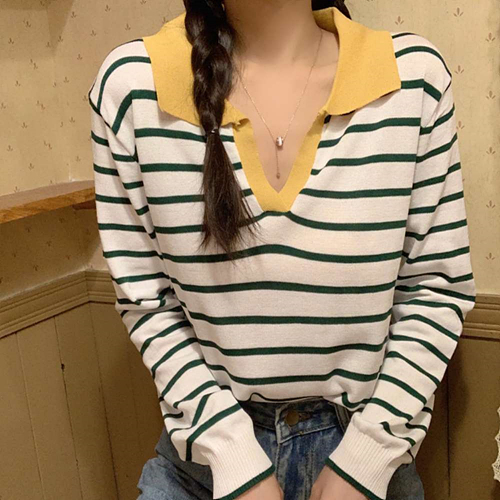 그린 스트라이프 줄무늬 옐로우 카라 니트 긴팔 티셔츠 J09
