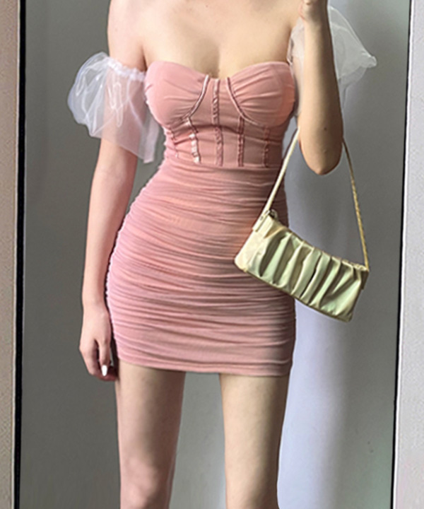 아멜리아 핑크레드 하트넥 오프숄더 시스루 퍼프 반소매 스키니핏 셔링 미니 원피스