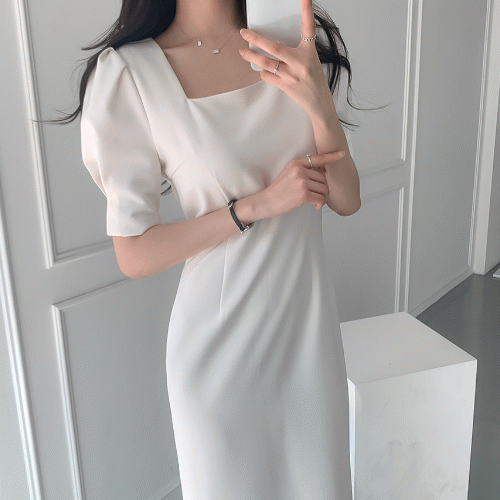 (S 당일발송) [셀프웨딩/하객룩] 브라이덜샤워 컨셉촬영 정장 페미닌 우아 쉬폰 스퀘어넥 화이트 퍼프 반팔 롱원피스 드레스 셀프웨딩