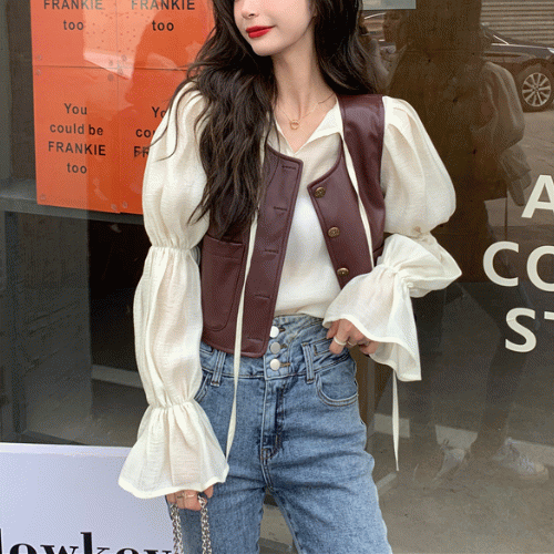 [세트상품] 유니크 카우보이 카우걸 포켓 슬림 루즈핏 크롭 라운드넥 민소매 탑 가죽 자켓 + 시스루 벌룬 소매 카라 끈리본 여리 루즈핏 미디 브이넥 긴팔 블라우스 투피스 셋업 세트
