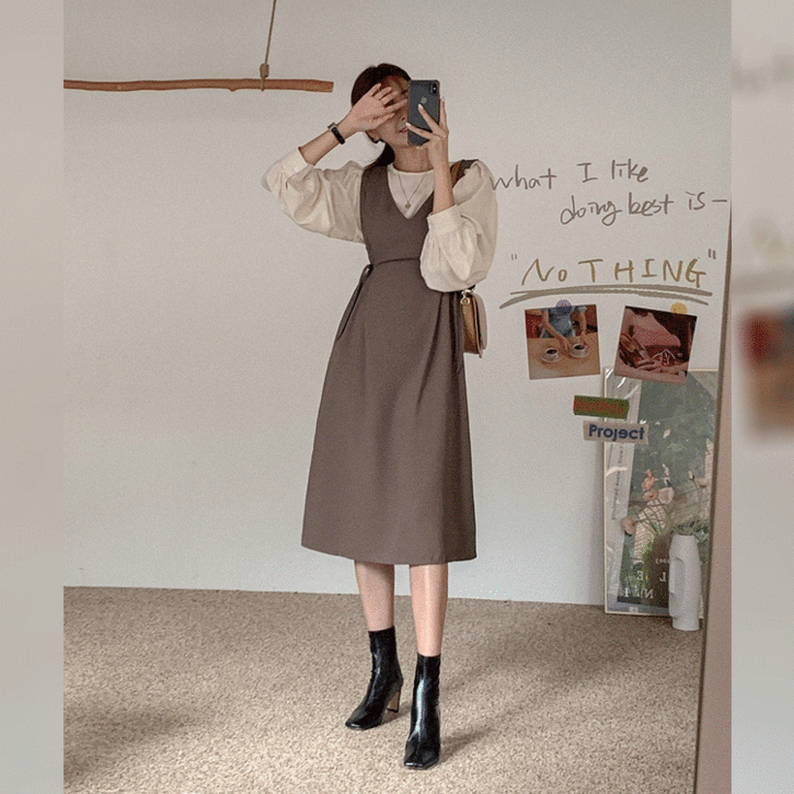 [SET]셔링블라 리본롱원피스세트