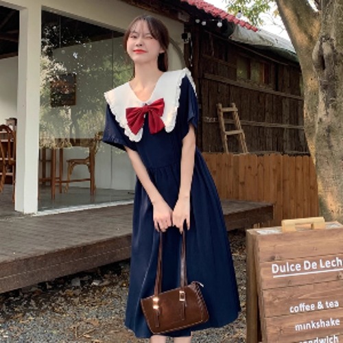 [빅사이즈룩/여름원피스/해외여행]데일리 통통녀 교복 스타일 반팔롱원피스 세일러카라 리본 루즈핏 블랙 네이비 A라인 플레어 롱스커트 빈티지 복고 롱원피스 (일본/오사카/해외여행/귀여운 옷/ 교복/데이트룩) ~2XL 4XL