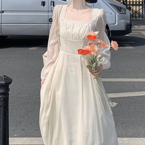 [봄신상/봄원피스]에스닉 스퀘어 퍼프 롱원피스 레이스 셔링 쉬폰 롱드레스 결혼식 브라이덜샤워 신혼여행 셀프웨딩 촬영 여행 중세 여신 허리잘록 A라인 플레어스커트 20대 30대 봄나들이 데이트룩 유럽