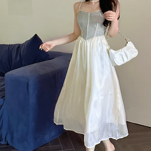 고르딕 블루 빈티지 뷔스티에 롱원피스 에스닉 레이스 끈 나시 셔링원피스 빅사이즈 a라인 메쉬스커트 청순 여리핏 허리잘록 바캉스 비치 해변 여행 20대 공주 코디