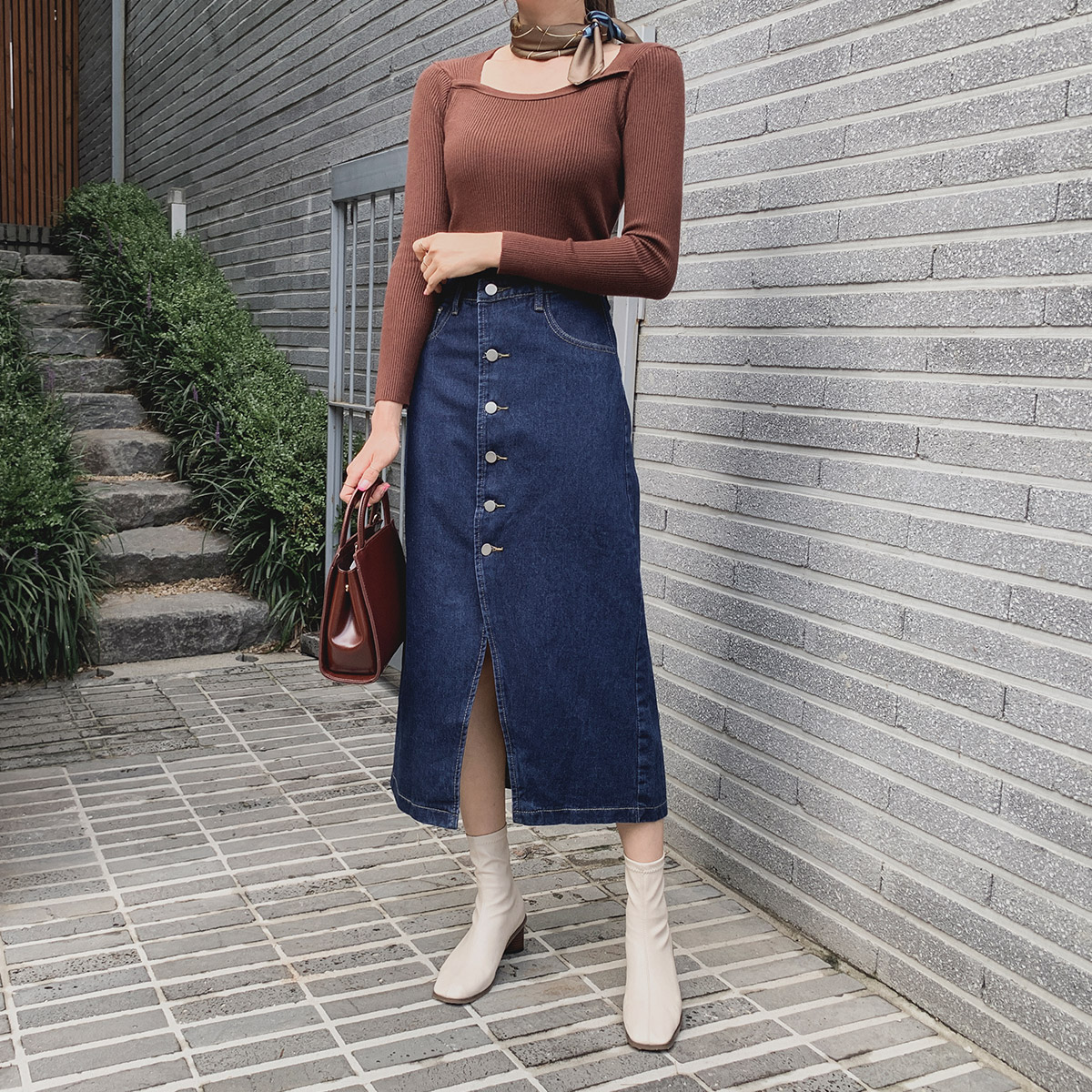 앞트임 버튼 롱 청치마 데님 스커트 단추 진청 슬림 하이웨스트