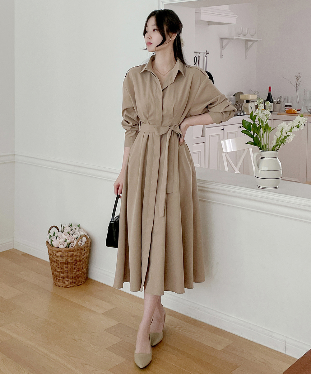 솔라 봄 가을 하객룩 벚꽃룩 트렌치 카라 핀턱 시크릿 버튼 플리츠 A라인 셔츠 롱 원피스